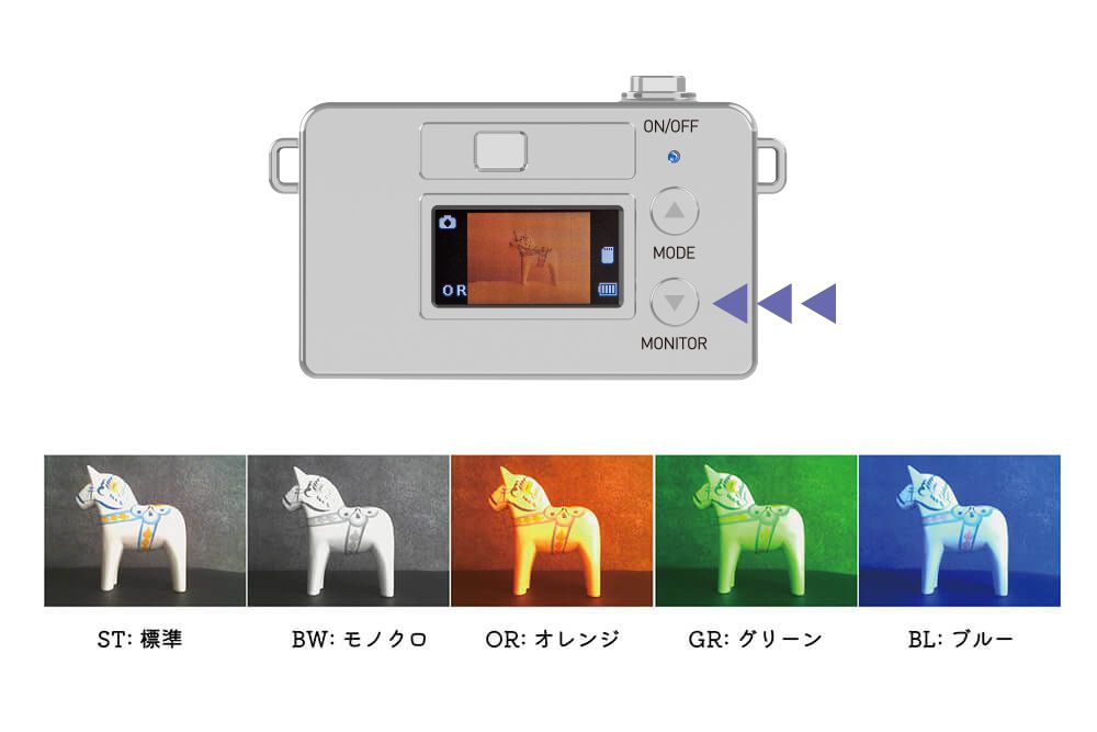 You can change the color filter by pressing the MONITOR button in still image mode or video mode. By applying color filters, even familiar scenery can become mysterious and interesting.