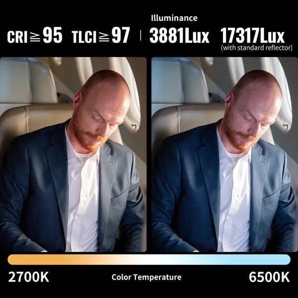 Allow you to adjust color temperature at fingertip. Give you accurate fidelity that rivals against traditional heavy COB lights. Illuminance: 3881 Lux (4500K at 100% brightness)