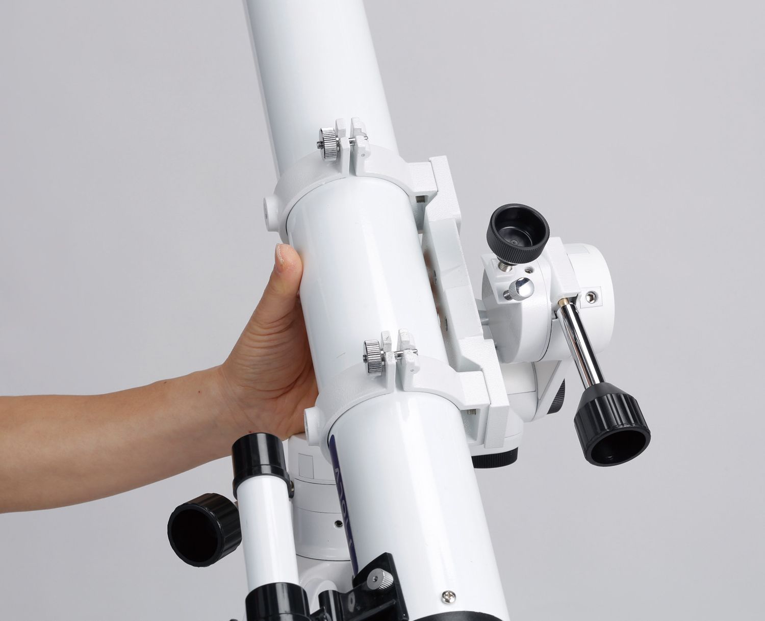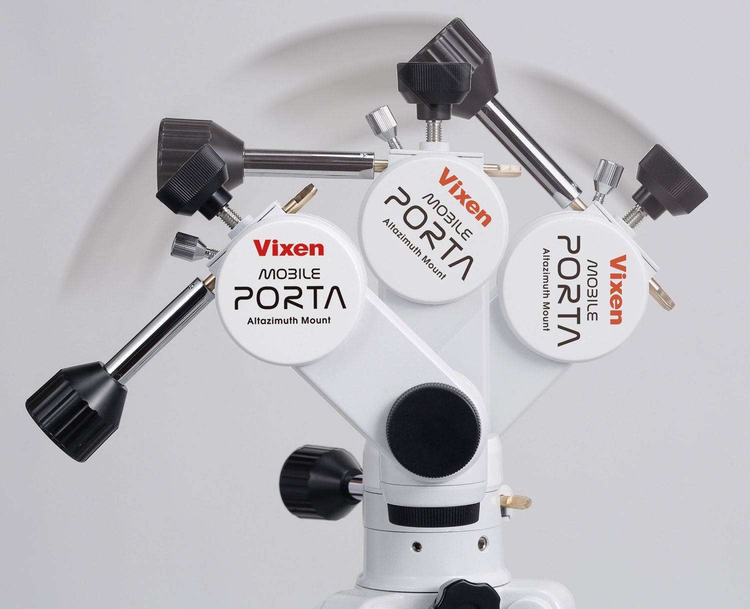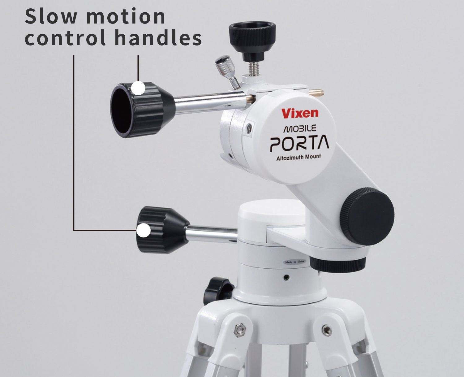 Slow motion control handlesThe slow motion control handles of the MOBILE PORTA allow for operating the mount in the whole-circle of the vertical and horizontal movements. It is helpful as used together with the friction stop mechanism when observing at high magnification. The position of the slow motion control handles can be changed if needed.